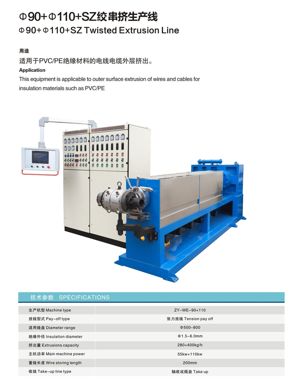 Φ90+110+SZ絞串擠出生產線適用于PVC/PE絕緣材料的電線電纜外層擠出。